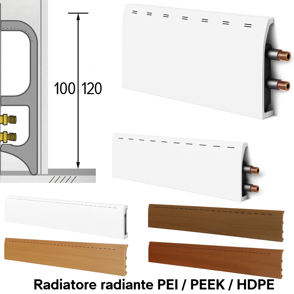 Il modulo radiante da 500 mm è una soluzione compatta ed efficiente per il riscaldamento perimetrale invisibile. Realizzato in PVC ad alta resistenza termica, è progettato per integrarsi perfettamente lungo la base delle pareti, offrendo comfort uniforme e discreto.